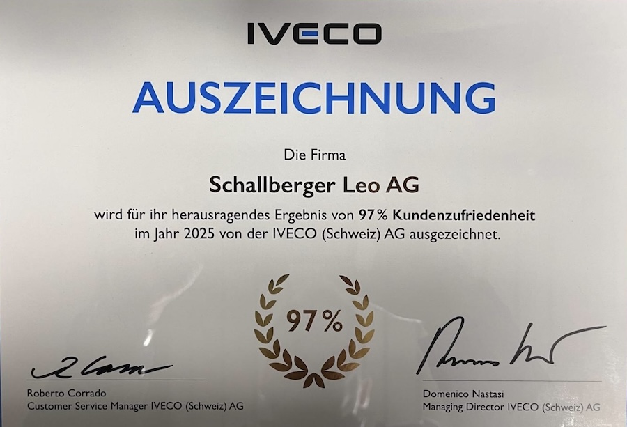 97% Kundenzufriedenheit – ausgestellt von IVECO (Schweiz) AG. Ein Erfolg der zeigt: Schallberger Leo AG ist «Bekannt für guten Service».